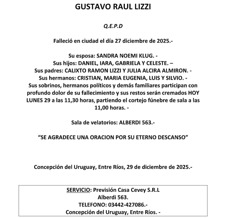 Fúnebres GUSTAVO RAUL LIZZI QEPD diciembre 28, 2025 Más Fúnebres Fúnebres Anadelia Bassini vda. de Picazzo (Delia ) QEPD Destacados Incumplió una restricción de acercamiento y fue detenido en el domicilio de su expareja Fúnebres María Teresita Elizabelar Q.E.P.D