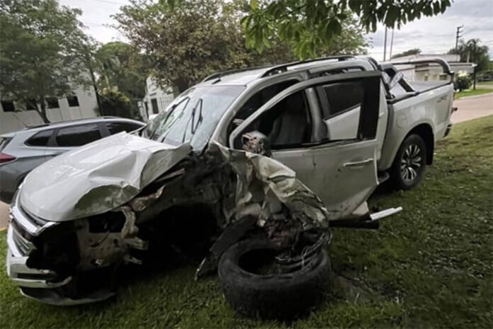 El conductor de una camioneta marca Chevrolet modelo S10, perdió el control e impactó contra una columna de alta tensión, quedando finalmente detenida sobre el espacio verde existente en el lugar.