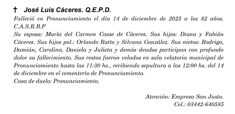 Fúnebres José Luis Cáceres QEPD diciembre 15, 2025 Más Fúnebres Fúnebres Ofelia Graciela Richard Q.E.P.D Fúnebres Camila Teresa Benitez de Alcaraz q.e.p.d Fúnebres Aurelia Erminda Dening vda. de Rochas QEPD