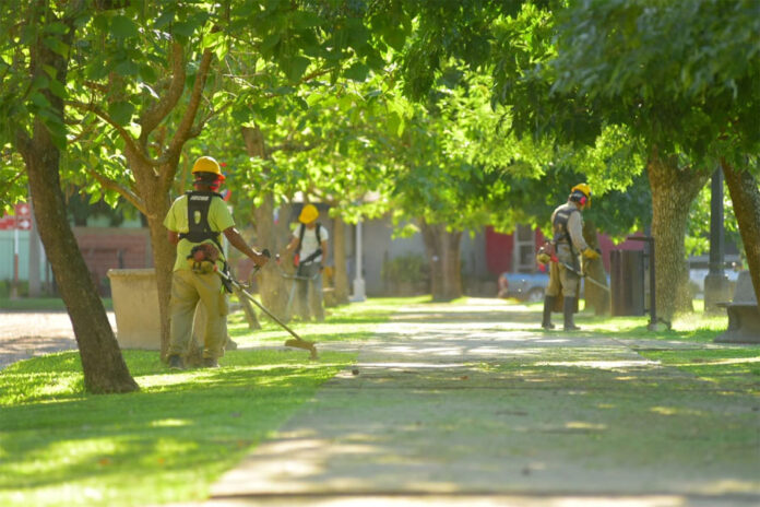 Entre sus tareas se incluyen el corte de césped, riego, poda y limpieza de paseos, plazas y plazoletas. Paralelamente, otro equipo trabaja en el vivero municipal y en el taller de carpintería, donde se producen plantas destinadas a la reforestación de los espacios públicos y se realizan tareas de reparación de bancos.