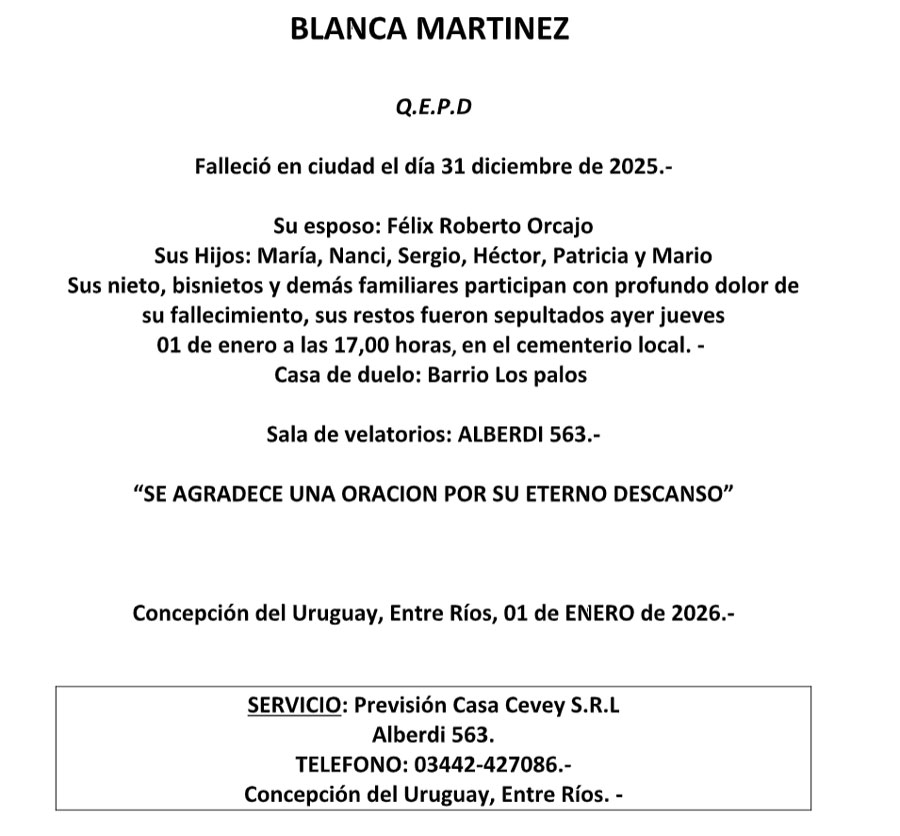 Fúnebres BLANCA MARTINEZ QEPD enero 1, 2026 Más Fúnebres Destacados Incumplió una restricción de acercamiento y fue detenido en el domicilio de su expareja Fúnebres María Teresita Elizabelar Q.E.P.D Fúnebres Jose Luis Ceballos Q.E.P.D.