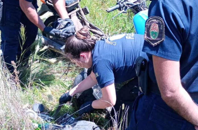 El procedimiento tuvo lugar alrededor de las 12:40 horas en una propiedad quinta ubicada sobre la ex Ruta Nacional N° 14, en la zona de Colonia Flores. Tras un exhaustivo rastrillaje por el predio, los efectivos divisaron una motocicleta Corven Energy de color azul.