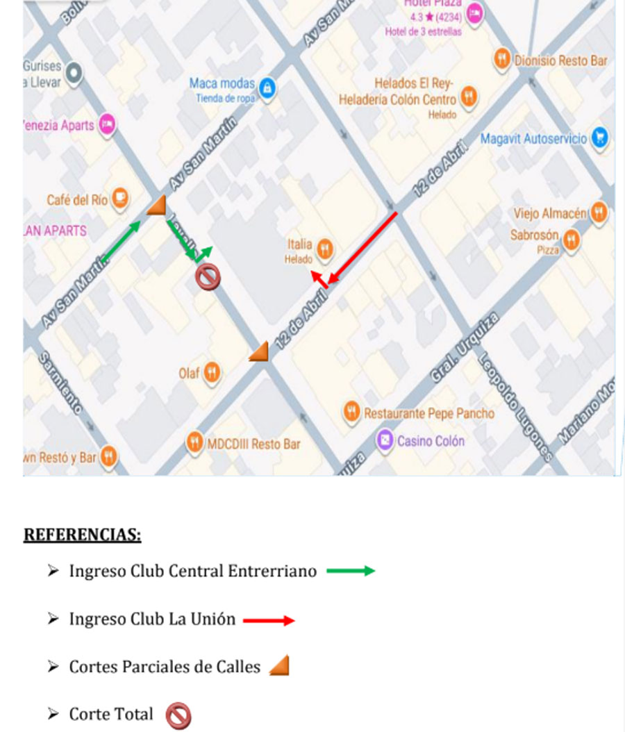 - En tanto la parcialidad del Club Centro Entrerriano (visitante), lo harán de forma peatonal por el acceso ubicado sobre Calle Lavalle en sentido contrario a la circulación vehicular, reiterándose y desconcentrándose a la inversa, pudiendo estacionar los vehículos sobre Calle San Martin y/o Lavalle al Norte.