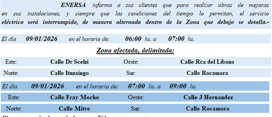 Concepción del Uruguay: ENERSA anunció dos cortes de energía este viernes enero 8, 2026 FacebookWhatsAppTwitter ENERSA comunicó que este viernes se llevarán a cabo dos interrupciones programadas del suministro eléctrico en Concepción del Uruguay, a raíz de trabajos de mejora del servicio.