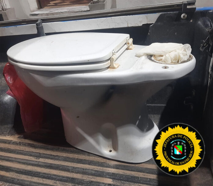 El operativo comenzó alrededor de las 23:10 horas del sábado, cuando un llamado anónimo alertó a la Comisaría Primera sobre un sujeto que caminaba por la intersección de calles Los Tulipanes y Urquiza cargando, literalmente, un inodoro sobre sus hombros.