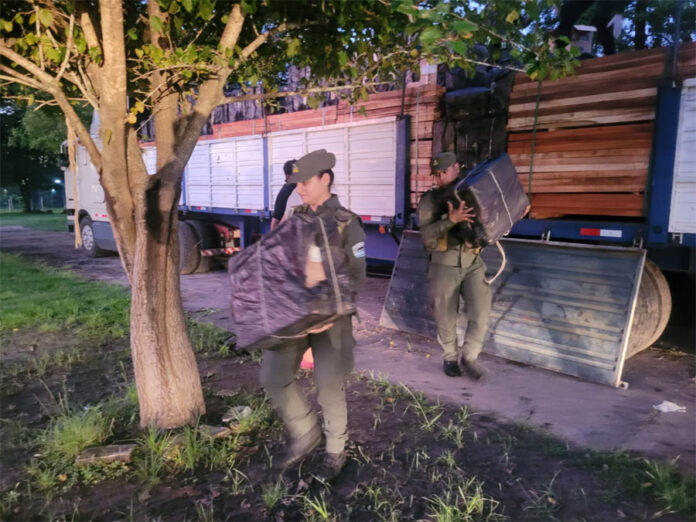 En presencia de testigos y, con la correspondiente autorización judicial, se procedió a la apertura de los precintos aduaneros detectándose un corte en la soga de seguridad, la cual se encontraba unida de forma artesanal con pegamento y un filamento metálico. Confirmando las sospechas de los gendarmes sobre la existencia de mercadería de contrabando. Al levantar la lona y, entre la carga de madera, se ocultaba 100.000 atados de cigarrillos de origen extranjero equivalentes a 10.000 cartones sin aval aduanero que acredite su legal tenencia.