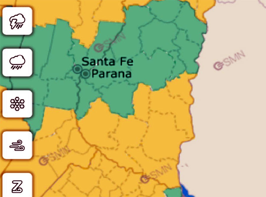 Los departamentos Tala, Colón, Uruguay, Victoria, Gualeguay, Gualeguaychú e Islas del Ibicuy serán afectados por tormentas de variada intensidad, algunas localmente fuertes. Las mismas estarán acompañadas por intensa actividad eléctrica, ocasional caída de granizo, ráfagas que pueden alcanzar los 70 km/h y abundante caída de agua en cortos períodos.