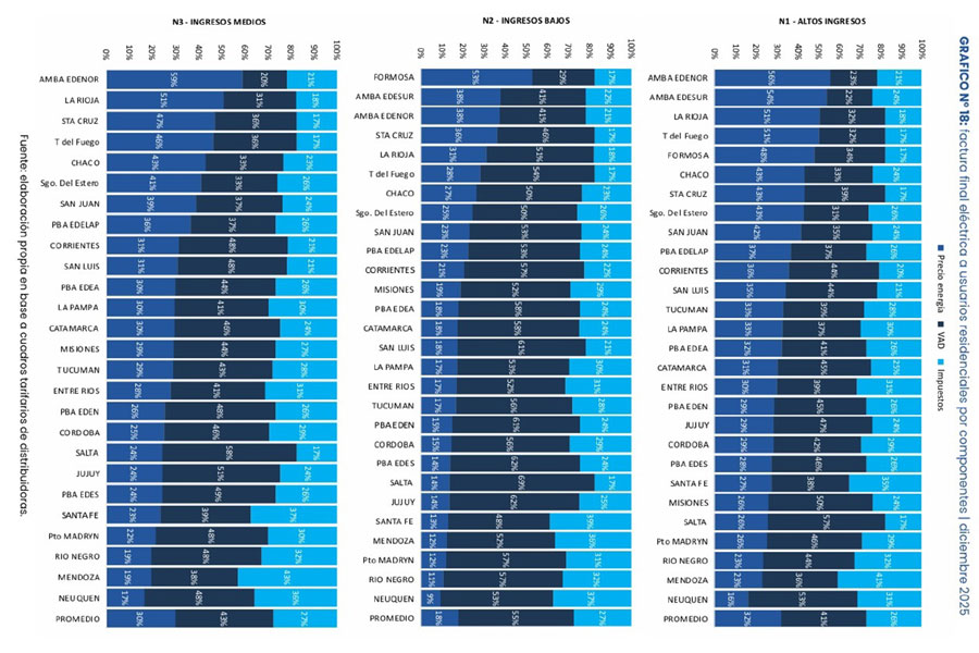 El informe analiza la composición de la factura eléctrica a partir del precio de la energía, el Valor Agregado de Distribución (VAD) y la carga impositiva, y muestra que Entre Ríos presenta un nivel tarifario inferior al promedio nacional en los tres segmentos de usuarios considerados: ingresos altos, medios y bajos. Esta situación consolida un esquema de mayor equilibrio tarifario en comparación con otras jurisdicciones del país.