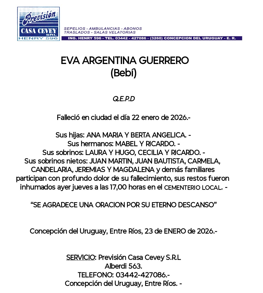 Fúnebres Eva Argentina Guerrero (Bebi) enero 22, 2026 Más Fúnebres Fúnebres Oscar Ramón Alem QEPD Fúnebres Agustin Rodolfo Breganni (Clavo) Q.E.P.D Fúnebres Renee Francisco Crosignani Q.E.P.D