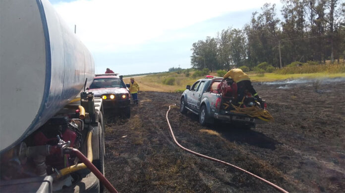 Bomberos de Ceibas y Médanos trabajaron intensamente en dos focos ígneos. En la Ruta 12, el fuego afectó campos de la Estancia «La Pelegrina» y el tendido eléctrico, mientras que en Médanos las llamas llegaron a la zona urbana.