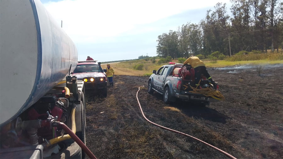 A las 07:59 horas del sábado, se activó la alarma por un incendio de pastizales en el kilómetro 163 de la Ruta Nacional N° 12. El operativo demandó el desplazamiento de cuatro unidades (Móviles 29, 25 y 10 del Cuartel Central, más el Móvil 30 del Destacamento Médanos).