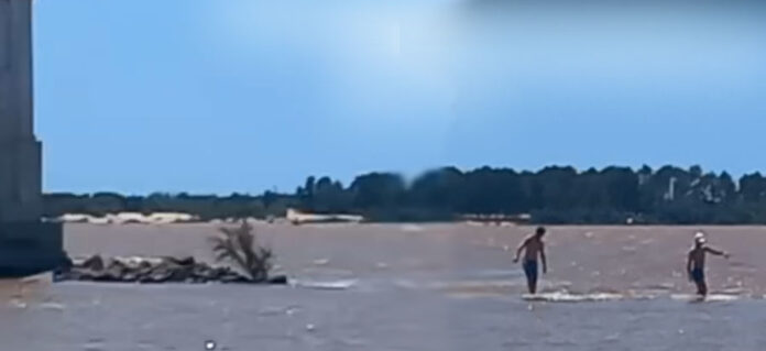 Con el río Uruguay crecido, el muralla de la Stella Maris en el canal de acceso al Puerto de Concepción del Uruguay, esta cubierto por el agua y hay una fuerte correntada que pasa sobre ella.