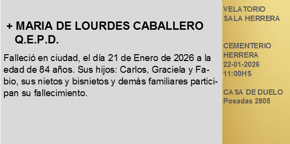 Fúnebres María de Lourdes Caballero QEPD enero 21, 2026 Más Fúnebres Fúnebres Aldo Rafael Benitez Q.E.P.D Fúnebres Maria Rosa Satto Vda de Dacuez Q.E.P.D Fúnebres Eduardo Horacio Carbone Q.E.P.D