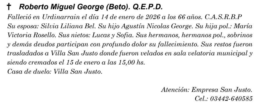 Fúnebres ROBERTO MIGUEL GEORGE (Beto) QEPD enero 15, 2026 Más Fúnebres Fúnebres ROSA INES DURE Vda de LENCINA QEPD Fúnebres Pablo Guillermo Barros Q.E.P.D Fúnebres Raúl Daniel Ríos Q.E.P.D