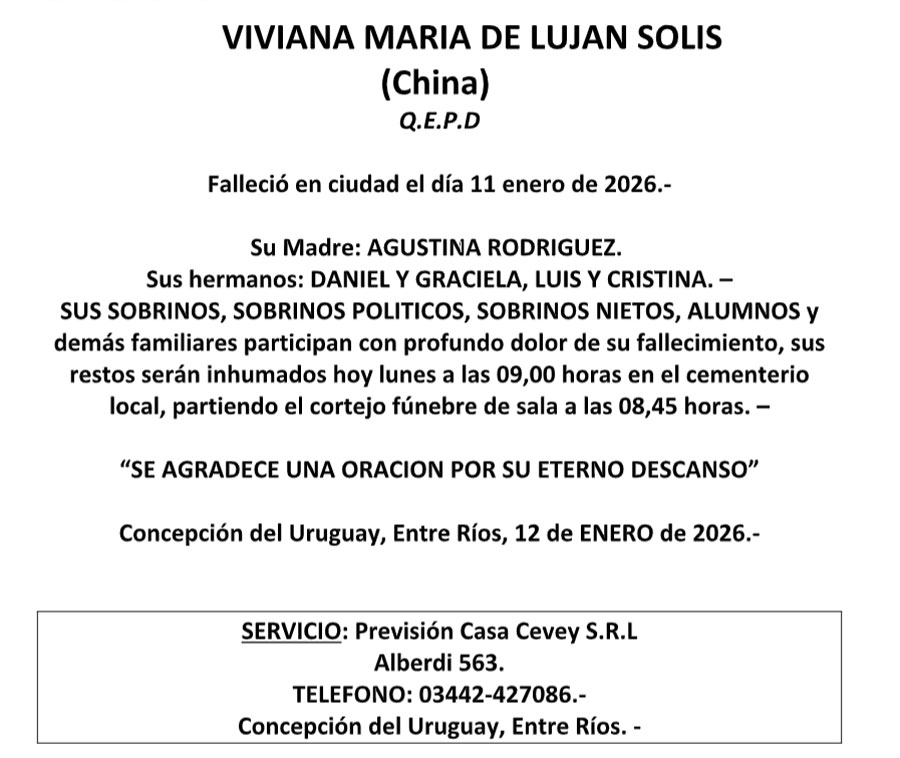 Fúnebres VIVIANA MARIA DE LUJAN SOLIS (China) QEPD enero 11, 2026 Más Fúnebres Fúnebres LUIS FONSECA QEPD Fúnebres Mirta Juana Bruno vda. de Frontelli QEPD Fúnebres Luis Fonseca QEPD