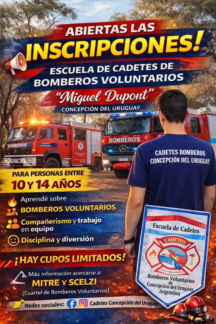 La Escuela de Cadetes de Bomberos Voluntarios “Miguel Dupont” de Concepción del Uruguay anunció la apertura de inscripciones para el ciclo 2026. Esta propuesta busca acercar a las nuevas generaciones a la labor bomberil a través de un espacio que combina lo educativo con lo recreativo.