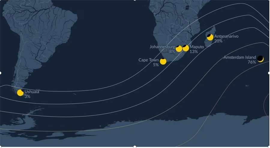 Éste eclipse sólo será visible en el sur de Sudamérica, Sur de África, Antártida y parte del océano Índico, aquí el mapa de la visibilidad del fenómeno, así que desde nuestra zona ni “nos daremos cuenta del evento” a pesar de las fake nwes que están circulando.