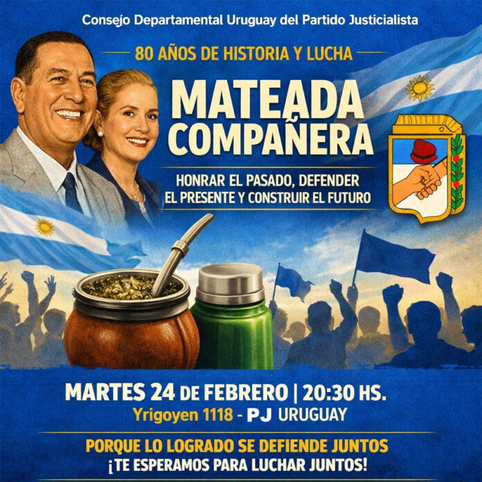 El Consejo Departamental Uruguay del Partido Justicialista invita a la comunidad a participar de una Mateada Compañera, un encuentro abierto de reflexión, memoria y compromiso colectivo, en el marco de la conmemoración de los 80 años de historia del movimiento peronista.