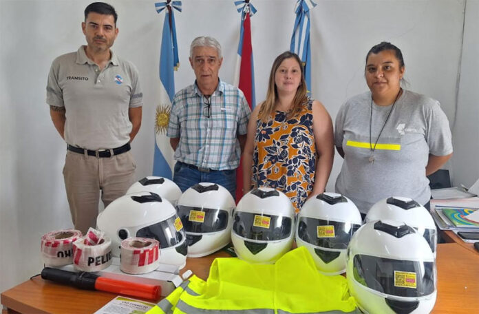 El equipamiento recibido incluye cascos homologados, y elementos de señalización y visibilidad, tales como: conos, chalecos reflectantes, bastones luminosos y cintas de peligro.