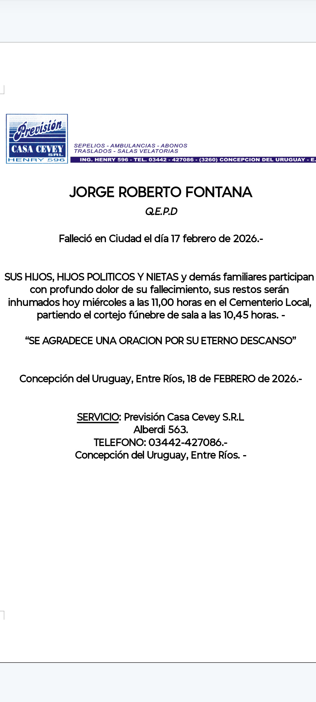 Fúnebres Jorge Roberto Fontana QEPD febrero 17, 2026 Más Fúnebres Fúnebres JOSÉ ERNESTO GARRO “PEPE”. Q.E.P.D Fúnebres Lorenzo Eugenio Vouilloud Q.E.P.D Fúnebres JOSÉ “PEPE” GARRO – Q.E.P.D