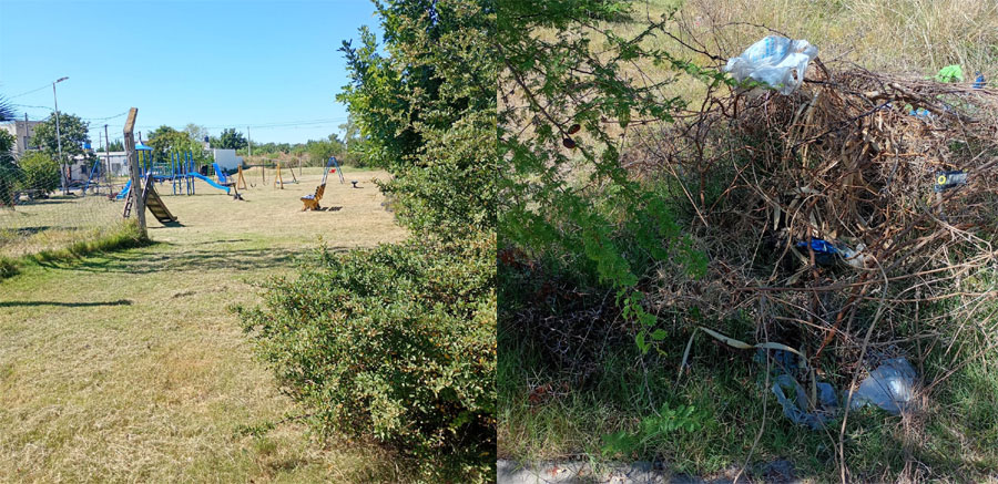 Según explicaron, el barrio termina en la urbanización con la plaza y casas, luego solo hay matorrales de pastos que hoy dejan y es muy peligroso por los incendios, la gante dice que al no limpiar esos pastizales que limitan el barrio se vieron muchas alimañas y hasta comadrejas en la plaza donde muchos chicos juegan todos los días.