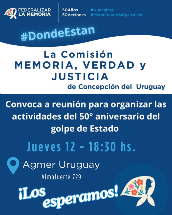 La Comisión Memoria, Verdad y Justicia de Concepción del Uruguay convoca a una reunión para organizar las actividades por el 50° aniversario del golpe de Estado en Argentina. Según informó la Dirección de Derechos Humanos, el encuentro se realizará este jueves, a las 18.30 en la sede de AGMER Uruguay, Almafuerte 729.