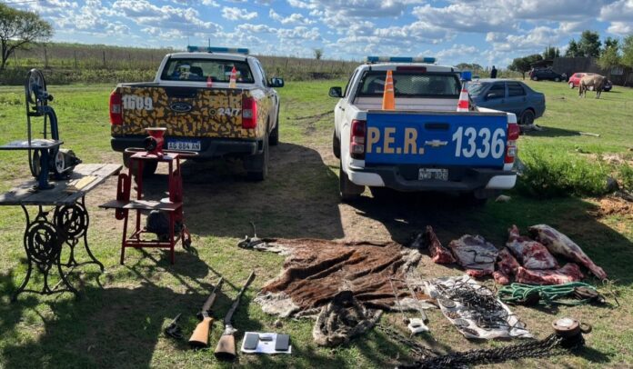 Al cumplimentar el procedimiento, los efectivos constataron la existencia de una carnicería improvisada con todos los elementos necesarios para la faena. En el lugar se procedió al secuestro de cortes cárnicos de origen bovino, diversos elementos utilizados para la faena y maquinarias destinadas al desposte y procesamiento de carne. Asimismo, se incautaron dos armas de fuego y teléfonos celulares.