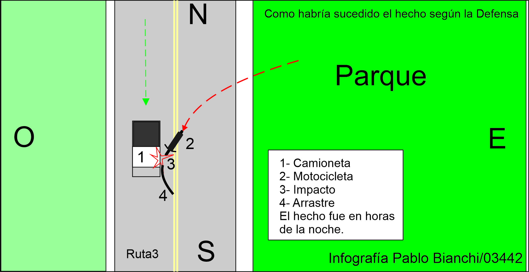 Respecto a la maniobra de la motociclista, el Dr. Silva, fue claro al indicar que esta salió del parque ubicado al este de la ruta, cruzando en diagonal al suroeste para incorporarse a la mano que va de norte a sur, con intenciones de dirigirse hacia Young.