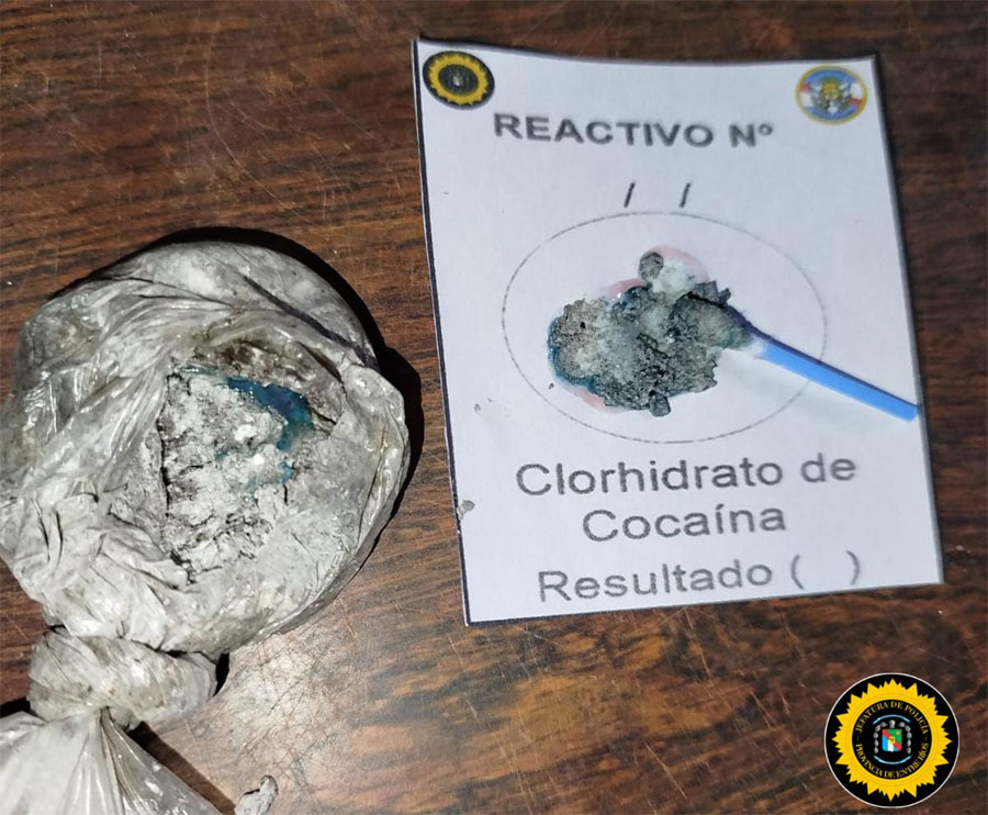 • Cocaína: Se secuestraron dos trozos compactos (en forma de piedra) de clorhidrato de cocaína, con un peso de 46 gramos. Según los investigadores, el estado de la droga indica que estaba lista para ser fraccionada en dosis menores.