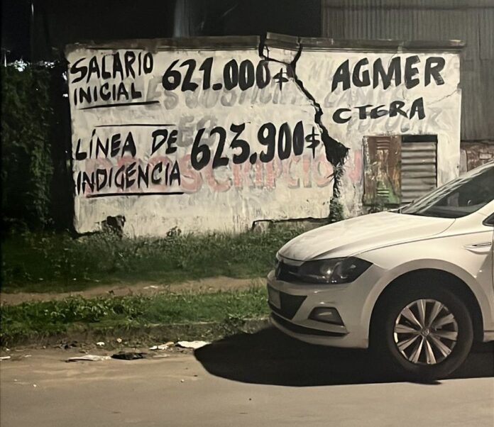 Durante la madrugada las paredes uruguayenses volvieron a hablar, reflejando una vez más la inadmisible realidad que sufre el conjunto de la docencia entrerriana, cuyo salario inicial está hoy por debajo de la línea de indigencia y la mayor parte del escalafón permanece sumergida en ingresos de pobreza.