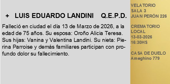 Fúnebres Luis Landini QEPD marzo 13, 2026 Más Fúnebres Fúnebres Estanislao Esteban Almeida Q.E.P.D. Fúnebres Beatriz Mirta Furnari Q.E.P.D. Fúnebres Daniel Oscar Fellay Q.E.P.D.