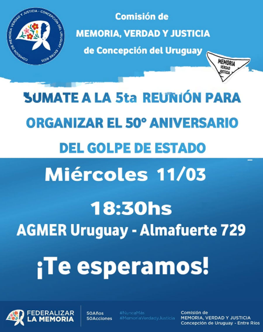 Nueva reunión organizativa 50º Aniversario del Golpe de Estado marzo 11, 2026 FacebookWhatsAppTwitter