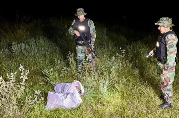 En ese contexto, el personal de la Fuerza implementó puestos de observación en distintos puntos estratégicos de la zona y, tras un rastrillaje en el lugar, los efectivos hallaron dos bultos ocultos entre la maleza.