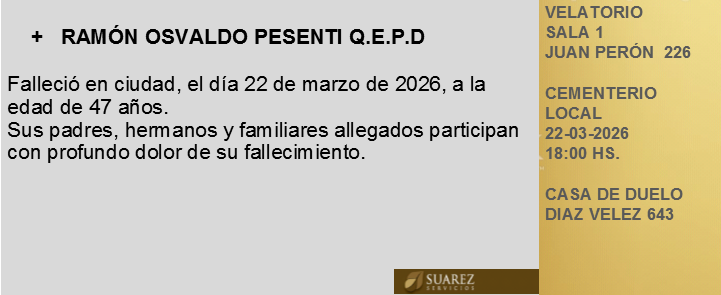 Fúnebres Ramón Osvaldo Pesenti QEPD marzo 22, 2026 Más Fúnebres Fúnebres Juan Maria Delersse QEPD Fúnebres RUBEN AKCIDES SCARIONE (Rubito) QEPD Fúnebres SILVIA BEATRIZ THEA de GONZALEZ QEPD
