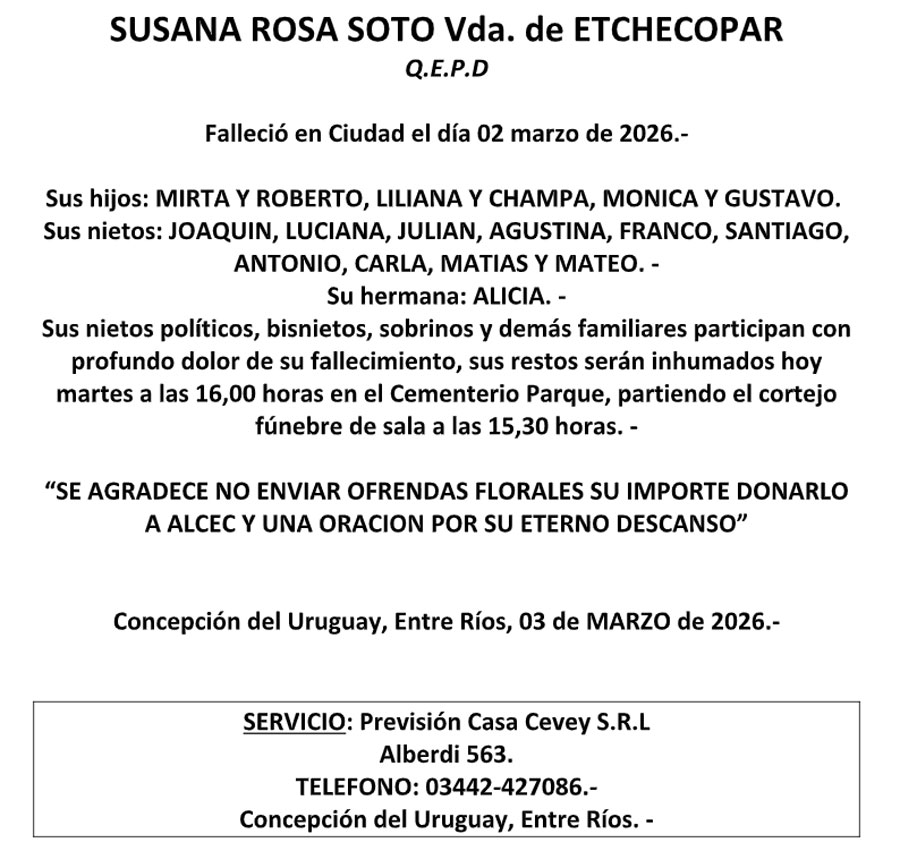 Fúnebres SUSANA ROSA SOTO Vda. de ETCHECOPAR QEPD marzo 2, 2026 Más Fúnebres Fúnebres Juan Bautista Vandemboch QEPD Fúnebres Emilce Marina Scolameri QEPD Fúnebres Silvia Guadalupe Ravelli de Díaz QEPD