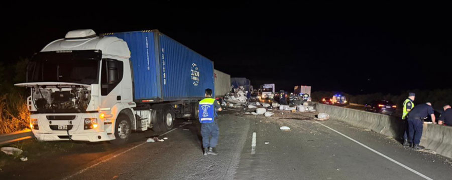 Una noche de extrema tensión se vivió este viernes en la Autovía Nacional 14 (Ruta General Artigas). Alrededor de las 20:30 horas, un grave accidente vial movilizó a dotaciones de bomberos, ambulancias, policía y Gendarmería Nacional tras un triple choque de camiones que dejó heridos de consideración y un riesgo ambiental en la zona.