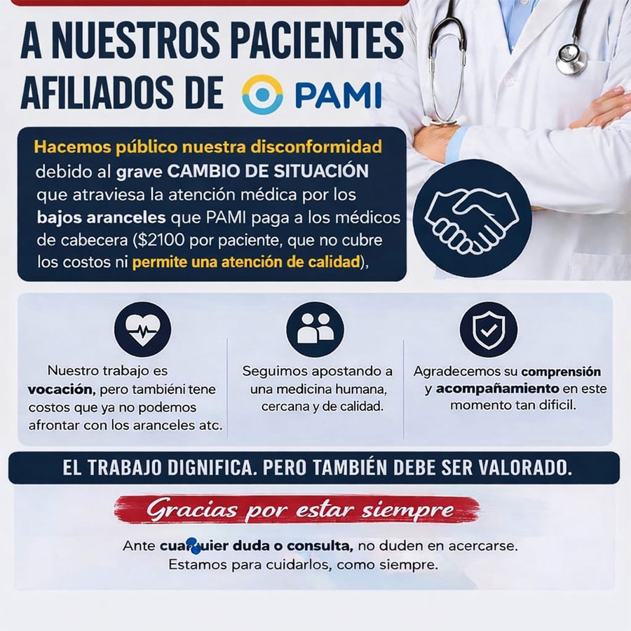 Ante la decisión del PAMI _de modificar unilateral e imprevistamente las condiciones contractuales de los Médicos de Cabecera que implica una disminución de entre el 30% y el 50% de los Honorarios mensuales y fijar en $2100 por mes el valor de la atención médica de los beneficiarios, los MC manifestamos nuestro absoluto desacuerdo, lo que nos ha puesto en estado de alerta sobre los anuncios y en evaluación de opciones a seguir.