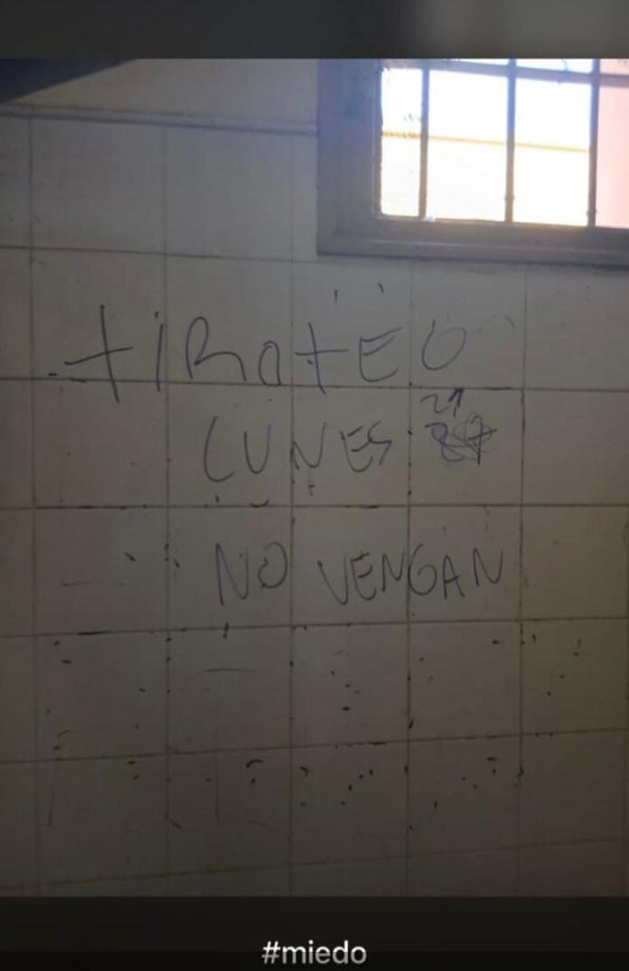 Según trascendió en las últimas horas, las pintadas fueron descubiertas por los propios alumnos en los sanitarios del sector correspondiente a primer año. El mensaje advertía explícitamente sobre un tiroteo previsto para el inicio de la semana entrante.