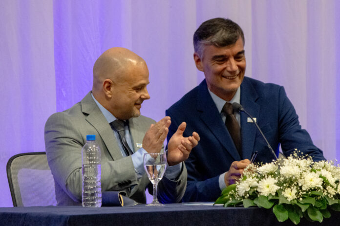 El pasado jueves 23 de abril, la Facultad de Ciencias de la Salud de la UNER celebró el acto de asunción de sus autoridades electas. En el Aula Magna de la sede Concepción del Uruguay, el Mg. Gregorio Etcheverry y el Mg. Ricardo Azario iniciaron formalmente su segundo mandato consecutivo como Decano y Vicedecano, respectivamente, renovando su compromiso en la conducción de la institución para el cuatrienio 2026-2030.