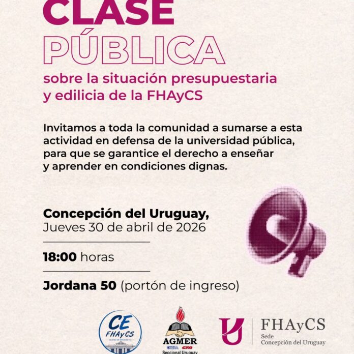 Este jueves 30 de abril se llevará a cabo una clase pública frente a la Sede Concepción del Uruguay de la Facultad de Humanidades, Artes y Ciencias Sociales (FHAyCS) de la Universidad Autónoma de Entre Ríos (UADER), ubicada en Jordana 50. Será a partir de las 18:00 y tendrá lugar en el ingreso del edificio que se comparte con la Escuela Normal. En la misma se abordará la delicada situación presupuestaria y edilicia que históricamente atraviesa la UADER, pero que se ha agravado de manera especial en estos últimos años.