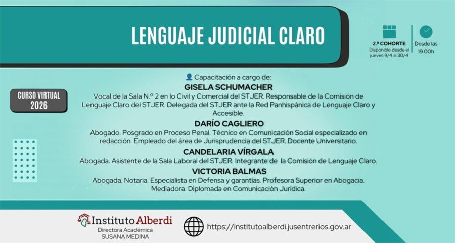 Los interesados en participar deben inscribirse de manera online en https://institutoalberdi.jusentrerios.gov.ar/events/curso-virtual-lenguaje-judicial-claro/