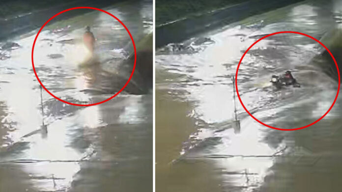 En medio de las intensas lluvias que azotaron a Concepción del Uruguay, los motociclistas intentaron transitar por la zona cuando la fuerza del agua, que baja desde el sector del FAPU y cruza por debajo del Acceso J.J. Bruno, los sacó de la vía.