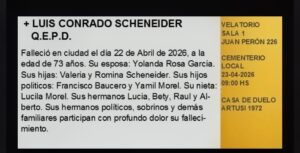 Fúnebres Luis Conrado Scheneider QEPD abril 22, 2026 Más Fúnebres Fúnebres Eliseo Del Carmen Nicero Q.E.P.D Fúnebres Jorge Anibal Rougier Q.E.P.D Fúnebres Nora Ester Duran de Aciar QEPD
