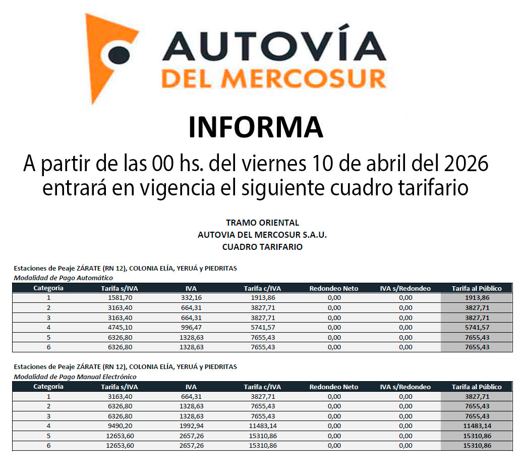 Nuevo cuadro tarifario de Autovía del Mercosur
