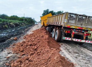 Camión volcador arrancó cables y tiró una luminaria