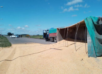 Vuelco de un acoplado cargado con granos en ruta 20