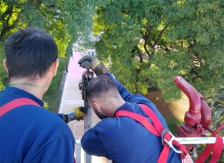 Con colaboración de Bomberos repararon el mástil de Plaza Ramírez